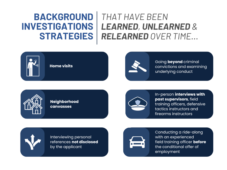 Law enforcement leaders should be prepared to defend their hiring practices by describing their efforts, outside of minimal in-office background checks, to identify possible character, integrity, and competence issues revealed by past conduct. This is particularly true in light of the financial and public trust costs associated with bad hires, when compared to the costs associated with a thorough background investigation.
