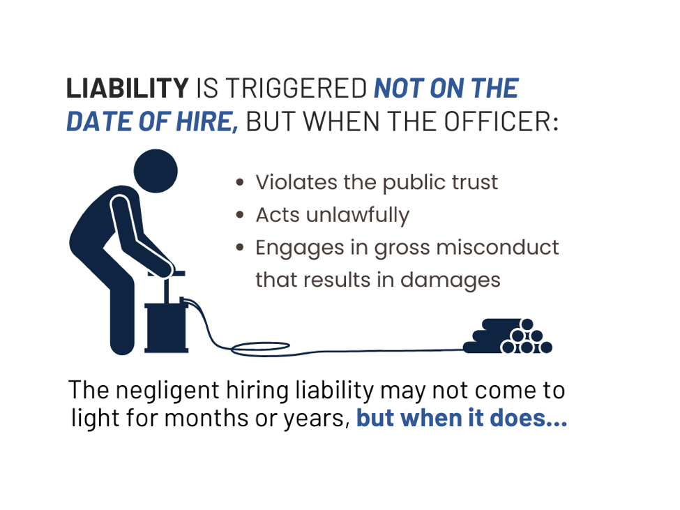 Neither officers nor the public benefit from unqualified law enforcement hires who undermine the profession instead of advancing its duty to protect and serve. The short-term accomplishment of swearing in more recruits and announcing their arrival to communities eager for more police services, pales in comparison to the long-term damage caused by hiring people right now instead of ensuring that they are hired the right way. Through careful reflection on past errors, awareness of common hiring pitfalls, and an understanding of the enduring consequences of negligent hiring, agency leaders can maintain professional integrity while avoiding harm to their agencies and the communities they serve.