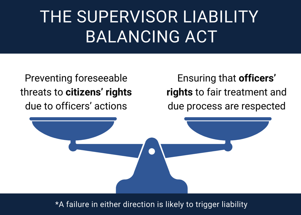 The Supervisor Liability Balancing Act can be extremely challenging in practice, but the concept is fairly simple. Supervisors—particularly those involved in decisions related to discipline, promotions, and terminations—must demonstrate due diligence in (1) preventing foreseeable threats to citizens’ rights due to employee misconduct and (2) ensuring that employees’ rights to fair treatment and due process are respected.